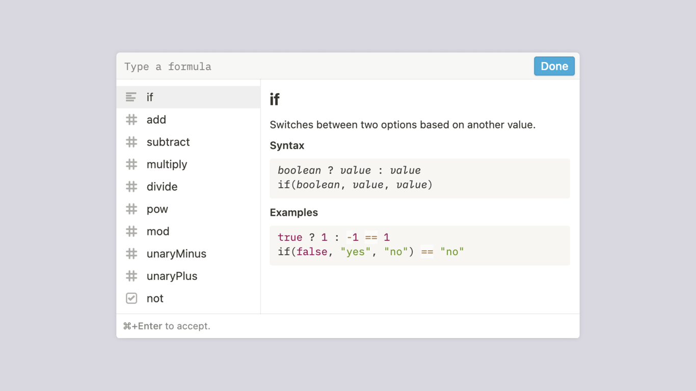 属性 Property列出所有在你的数据库中的属性。点击其中任何一个,就可以将其插入到你的公式中。Constants 常数常见的常数,如 π。点击任何一个就可以将其添加到你的公式中。Operators 操作符你可以运行的简单计算,它们左边的图标显示了它们的适用的属性类型。例如,减法和加法适用于 number 属性。Functions 函数你可以在 Notion 中运行更复杂的预定义公式。它们左边的图标也会显示它们所支持处理的属性类型。- 在窗口顶部的文本框中开始输入任何这些内容来搜索你需要的东西。