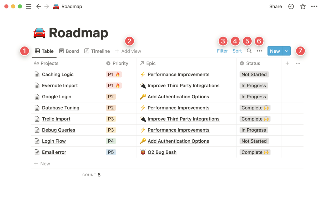 - 添加新视图按钮:向您的数据库添加一个新视图,具有自己的布局、过滤器和排序。