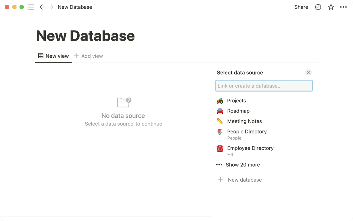如果您想要整合不同的信息、使用来自另一个数据库的相同属性,或者工作区其他地方的现有视图会有所帮助,我们建议选择现有数据源。您可以搜索现有数据库,然后选择您想要使用的数据库。