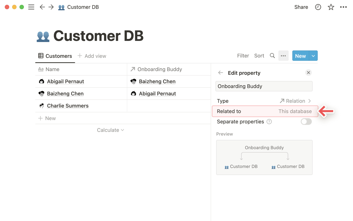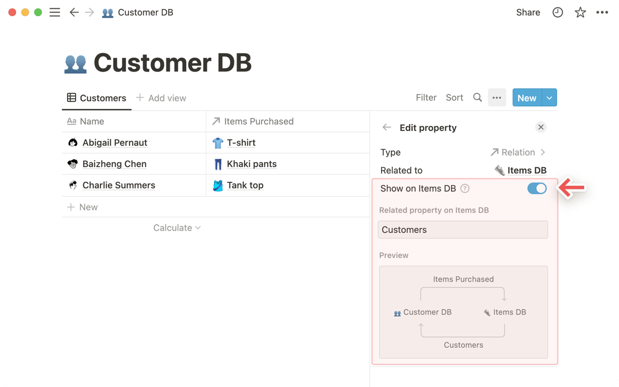 对于双向关系,编辑是双向的!因此,如果您将客户添加到 关系列中的 Items 数据库,更改将在您的 Customers 数据库中弹出。