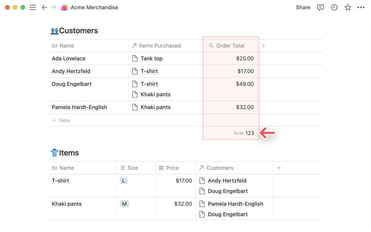 • 在下面的两个表中,标有↗ ItemsCustomers的列是关系属性,可以像其他的数据库属性一样被添加。