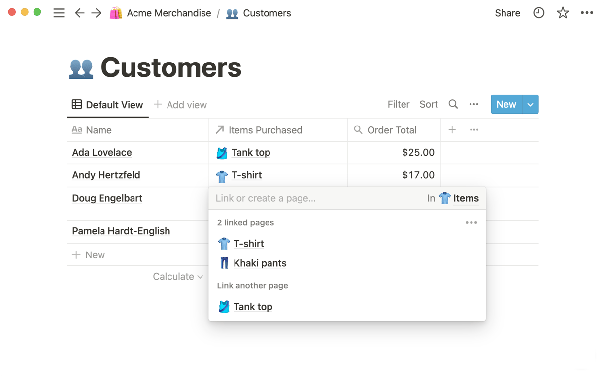 • 在这里,当你把购买的物品添加到客户数据库中时,购买它们的客户会自动出现在物品数据库的Customers列中。