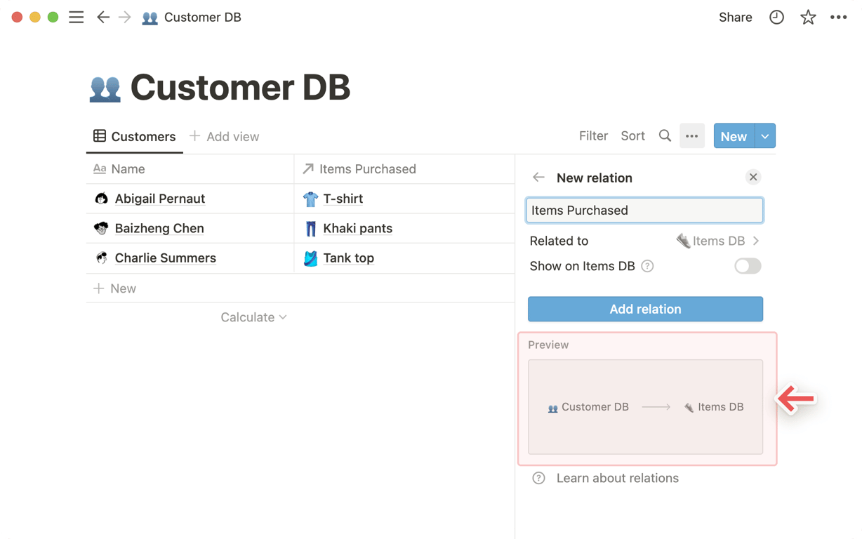 • 下面,您将看到双向关系的预览。在本例中,我们创建了一个从 Customer 数据库到 Items 数据库的关系,以及一个从 Items 数据库到 Customer 数据库的关系。