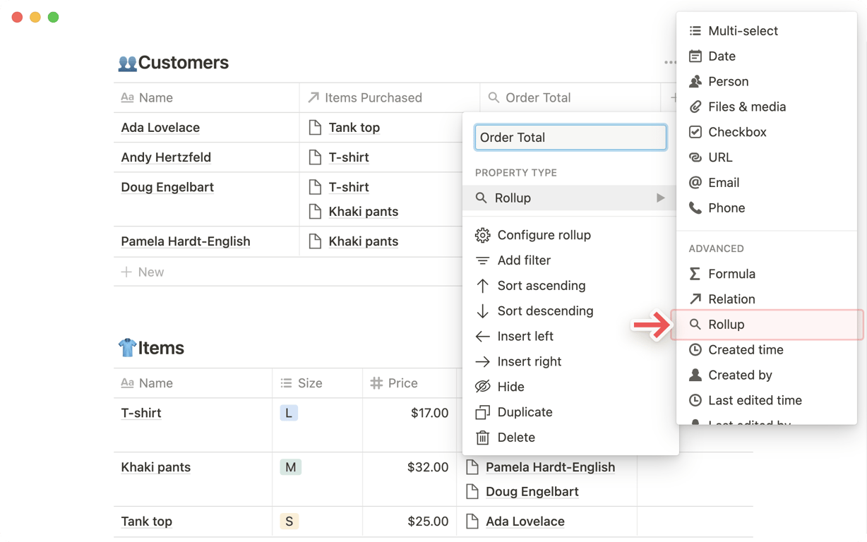 Rollups 帮助你根据关系在数据库中聚合数据。回到我们上面的客户和物品的例子,假设你想知道每个客户根据他们购买的东西花了多少钱。