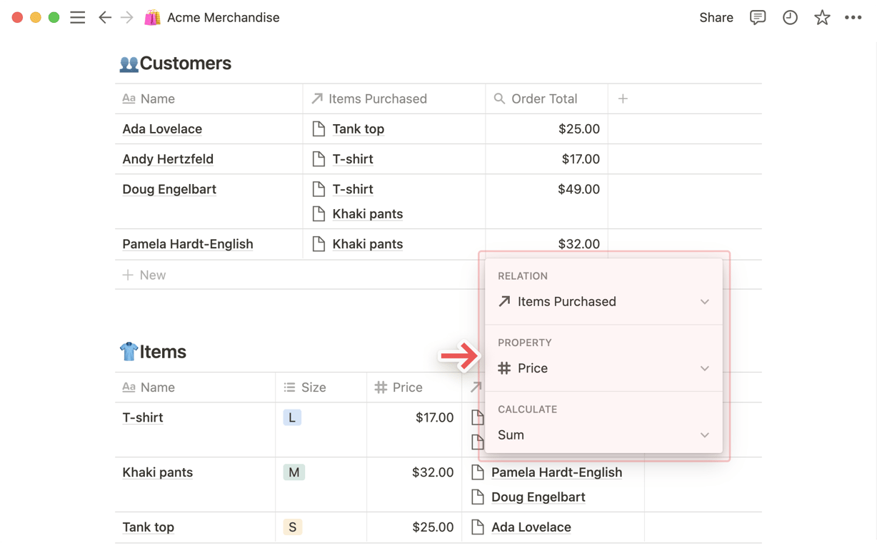 • 因此,对于我们的例子,你会选择汇总关系属性购买的项目 Items Purchased和这些页面中的价格 Price属性。然后你会选择 Sum作为汇总方法。