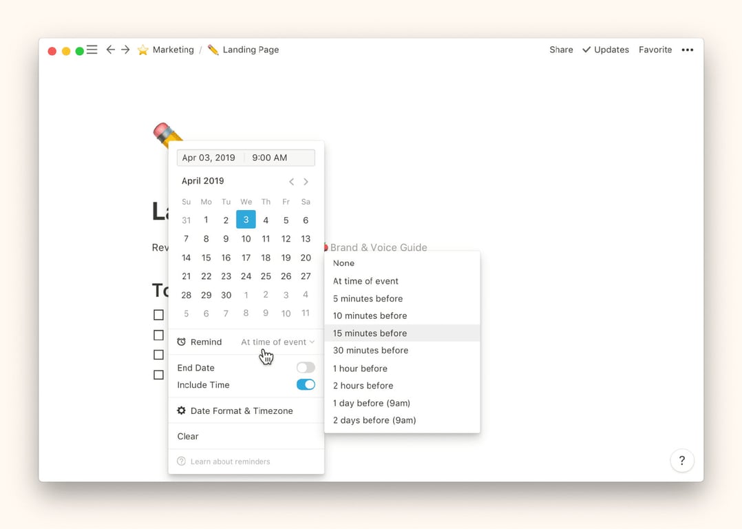 - 如果在你提醒的时候 Notion 没有打开,你会收到一个移动推送通知(如果你有这个应用)和一封邮件。