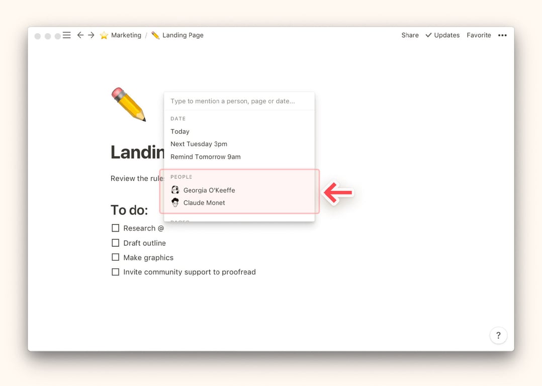 在页面上、讨论中或评论中提及某人。输入@,后面跟着这个人的名字。这将向他们发出通知,告诉他们你想让他们关注某件事情(他们也会看到侧边栏的 All Updates旁边出现一个红色提示)。