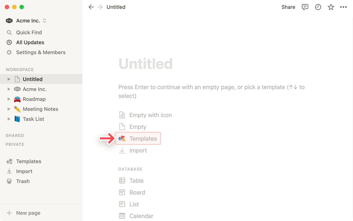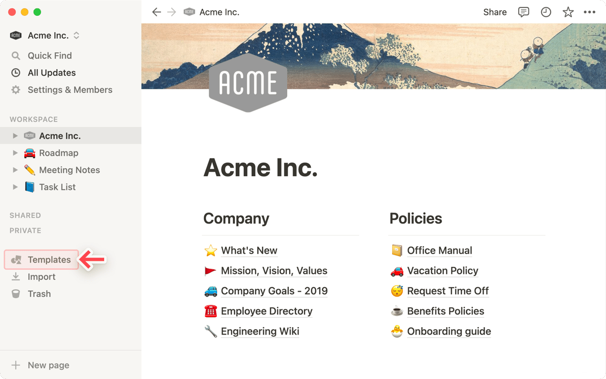 为了帮助您使用 Notion 应对各种挑战,我们创建了 50 多个模板,您可以采用这些模板并将其自定义为您自己的模板——包括 5 个已经在您的工作区中的“入门模板”!