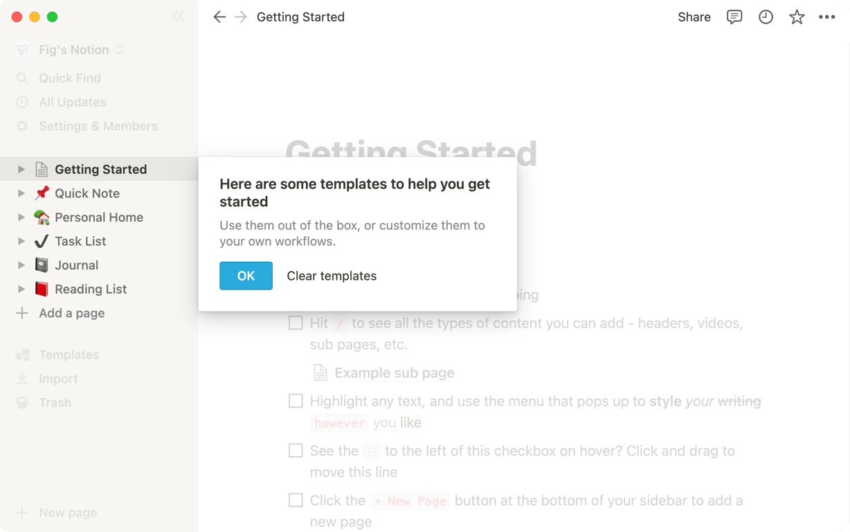 当您第一次注册 Notion 时,您会在侧边栏中看到 5 个模板的集合。这些是根据您在注册期间告诉我们的信息为您选择的。您可以选择将它们添加到您的工作区,以便您可以根据需要编辑或删除它们。