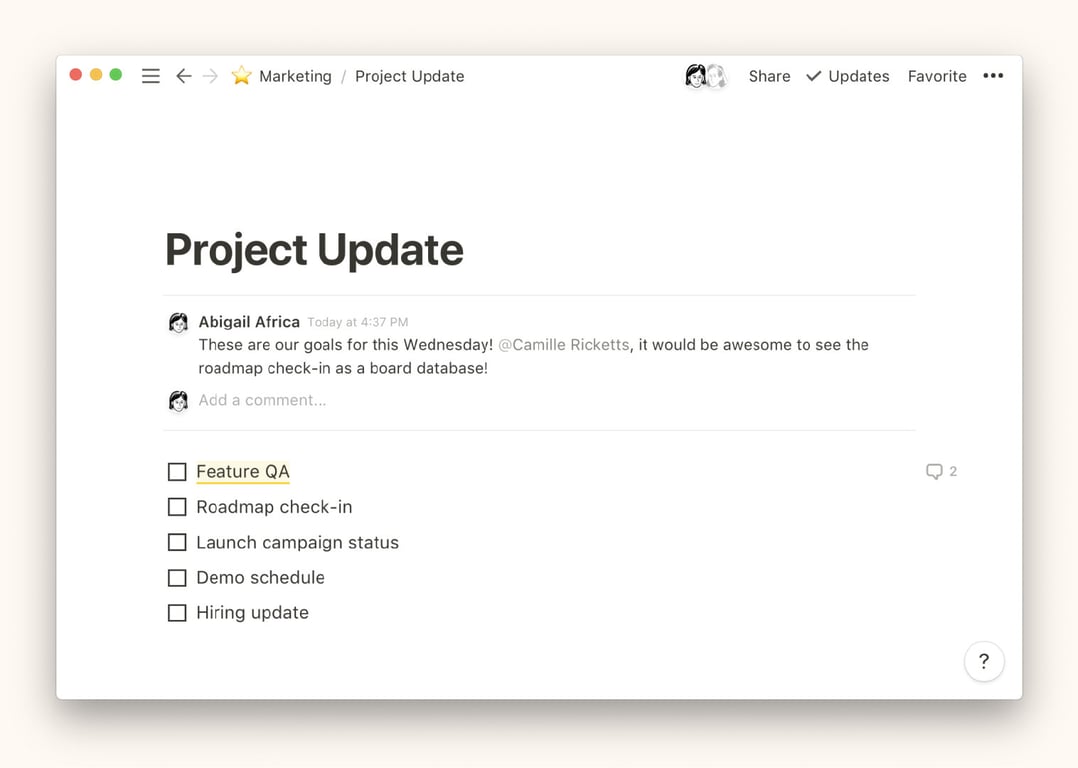 你可以在任何Notion页面的顶部以 Page comment 页面评论的形式添加一个迷你聊天室。这些评论可以帮助多人讨论一个项目,或者给出/获得高水平的反馈。