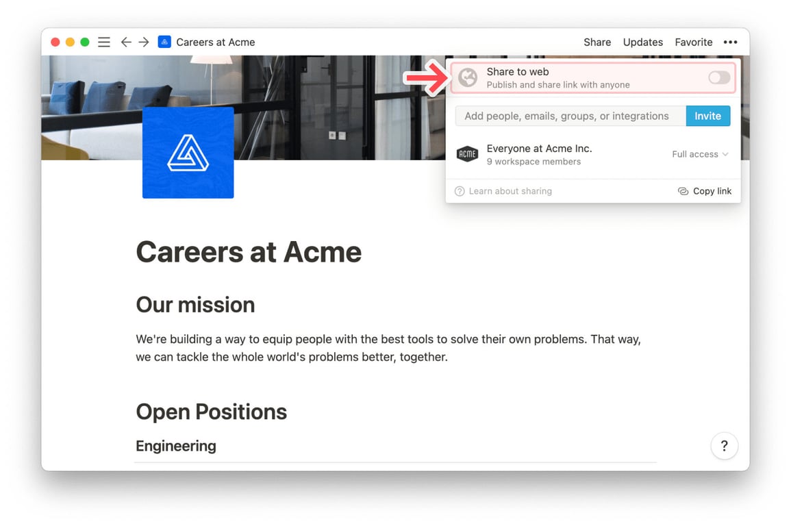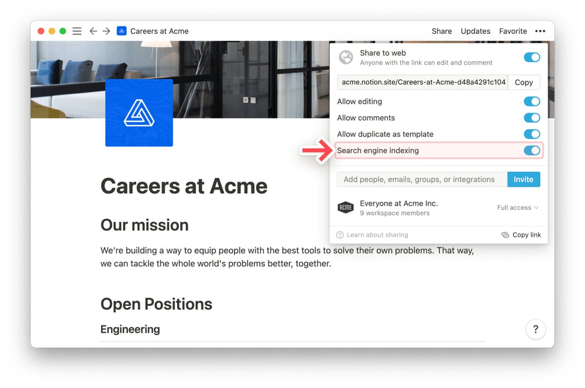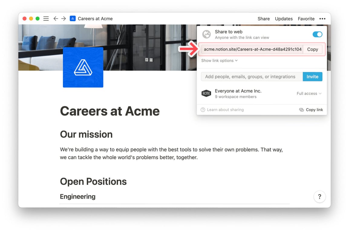 独特的acme.notion.siteURL只用于工作区的公开共享页面。在内部,你仍然会看到URL为notion.so/acme