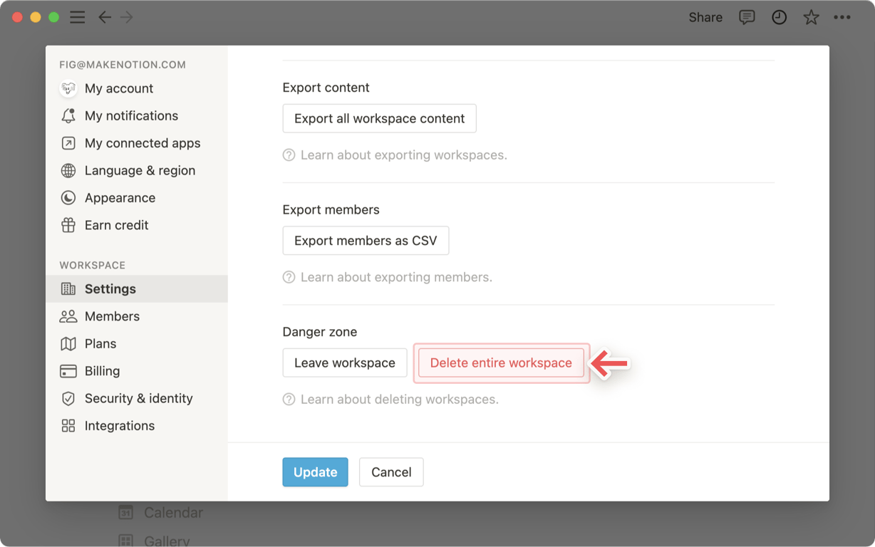 • 向下滚动到标题 Danger Zone。你会看到两个按钮,分别是 Leave WorkspaceDelete Entire Workspace